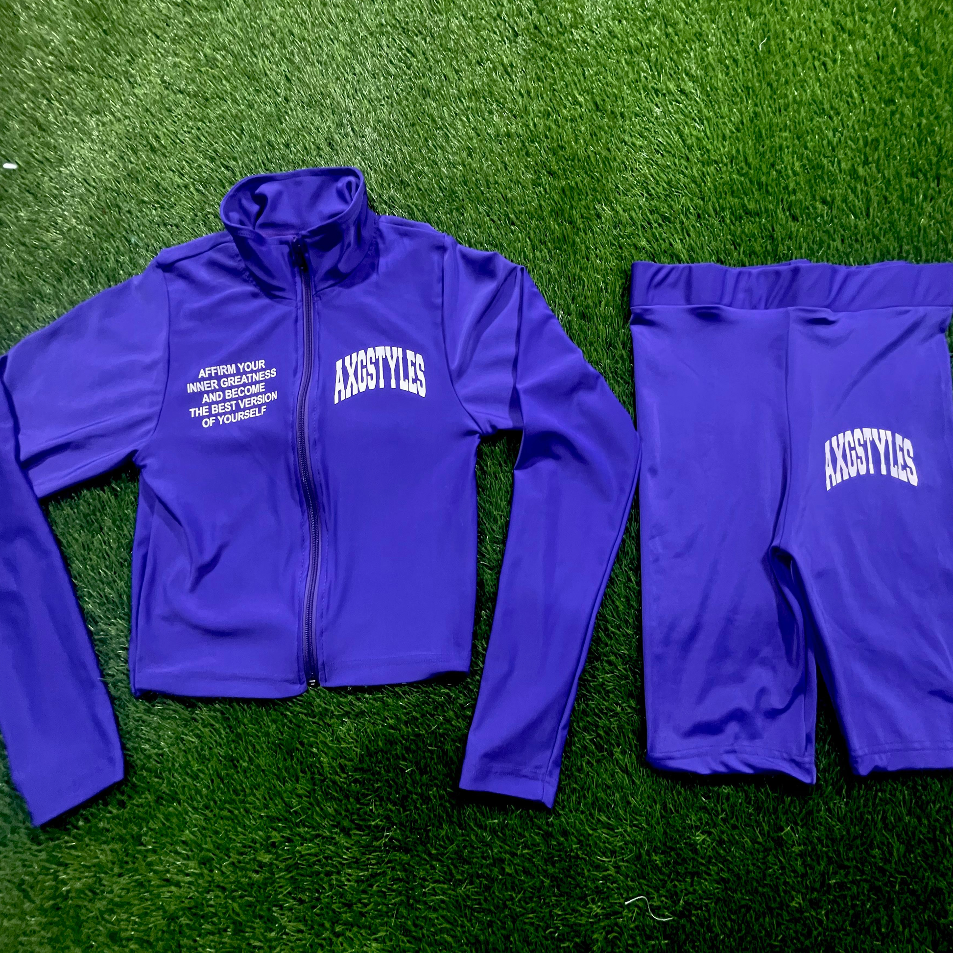 Available in Royal Purple and Jet Black, each set includes a cropped zip-up jacket and high-waisted biker shorts with signature AXGSTYLES branding for a sleek, confident finish.
